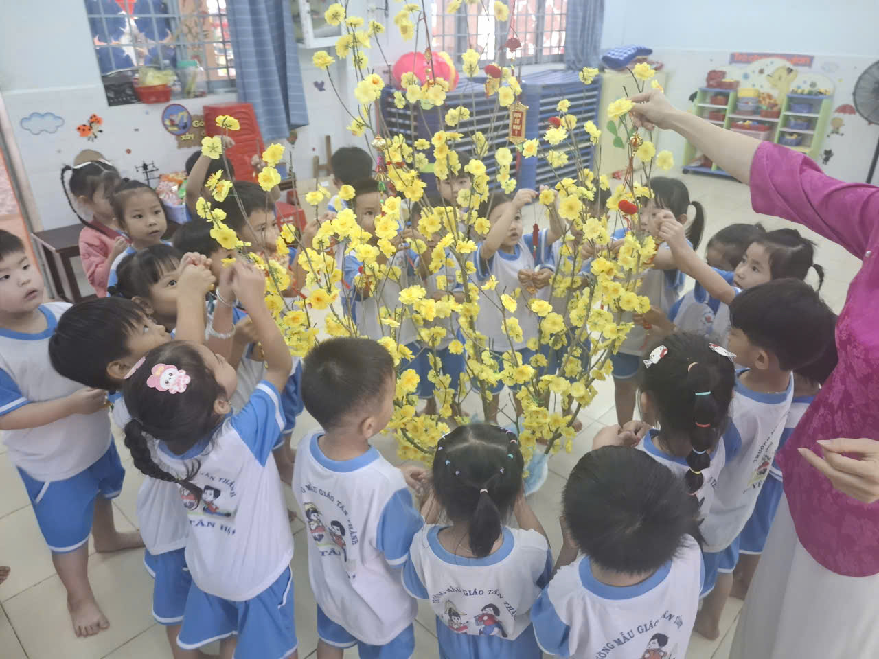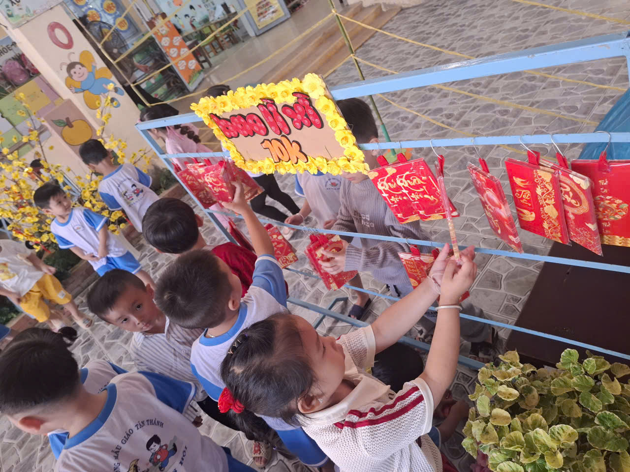 Các bé hào hứng tham gia trang trí cây mai với những cành hoa vàng rực rỡ, bao lì xì đỏ và các phụ kiện xinh xắn. Hoạt động không chỉ giúp trẻ phát huy sự khéo léo mà còn mang đến niềm vui khi cùng nhau tạo nên không gian Tết ấm áp.