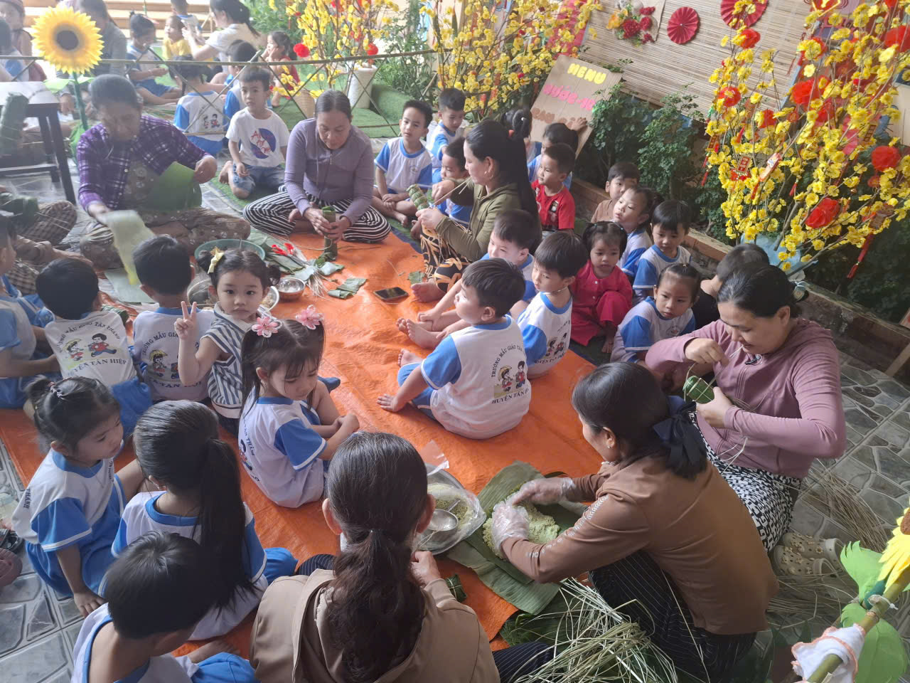 Dưới sự hướng dẫn của cô giáo và các vị phụ huynh, các bé được làm quen với việc gói bánh tét – một nét đẹp đặc trưng của ngày Tết Việt Nam. Từng chiếc bánh nhỏ xinh do chính các bé góp công thực hiện đã mang lại sự thích thú và giúp trẻ hiểu thêm về ý nghĩa của món bánh truyền thống.