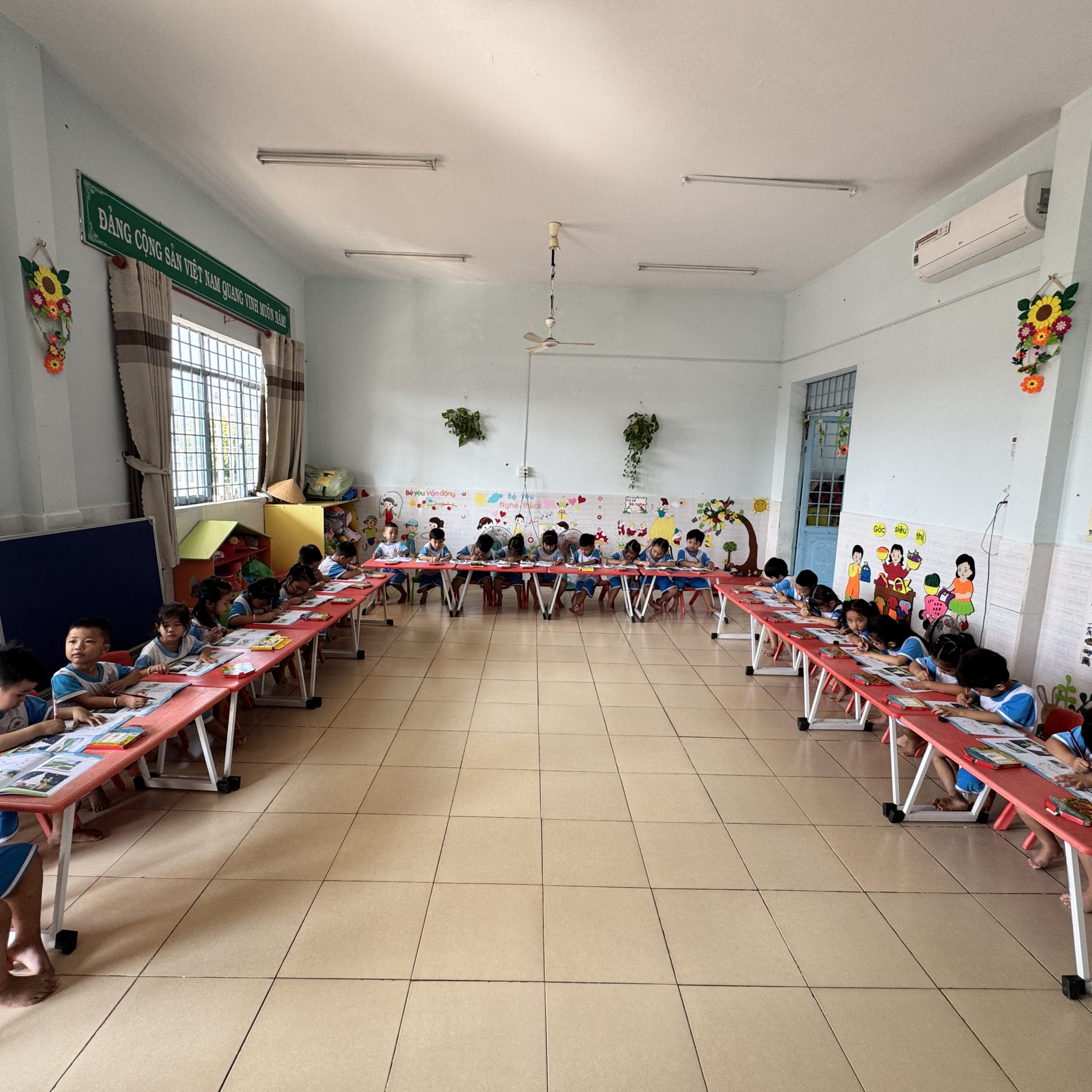 Lớp Chồi 3 đang chăm chú ngồi học, mỗi bạn đều tập trung làm sách làm quen chữ cái. Các em cẩn thận tô từng nét chữ, phát âm rõ ràng theo hướng dẫn của cô giáo. Không khí lớp học trở nên yên tĩnh nhưng rất sôi nổi với tinh thần học tập tích cực. Qua hoạt động này, các bé dần nhận biết và ghi nhớ các chữ cái một cách tự nhiên và vui vẻ.