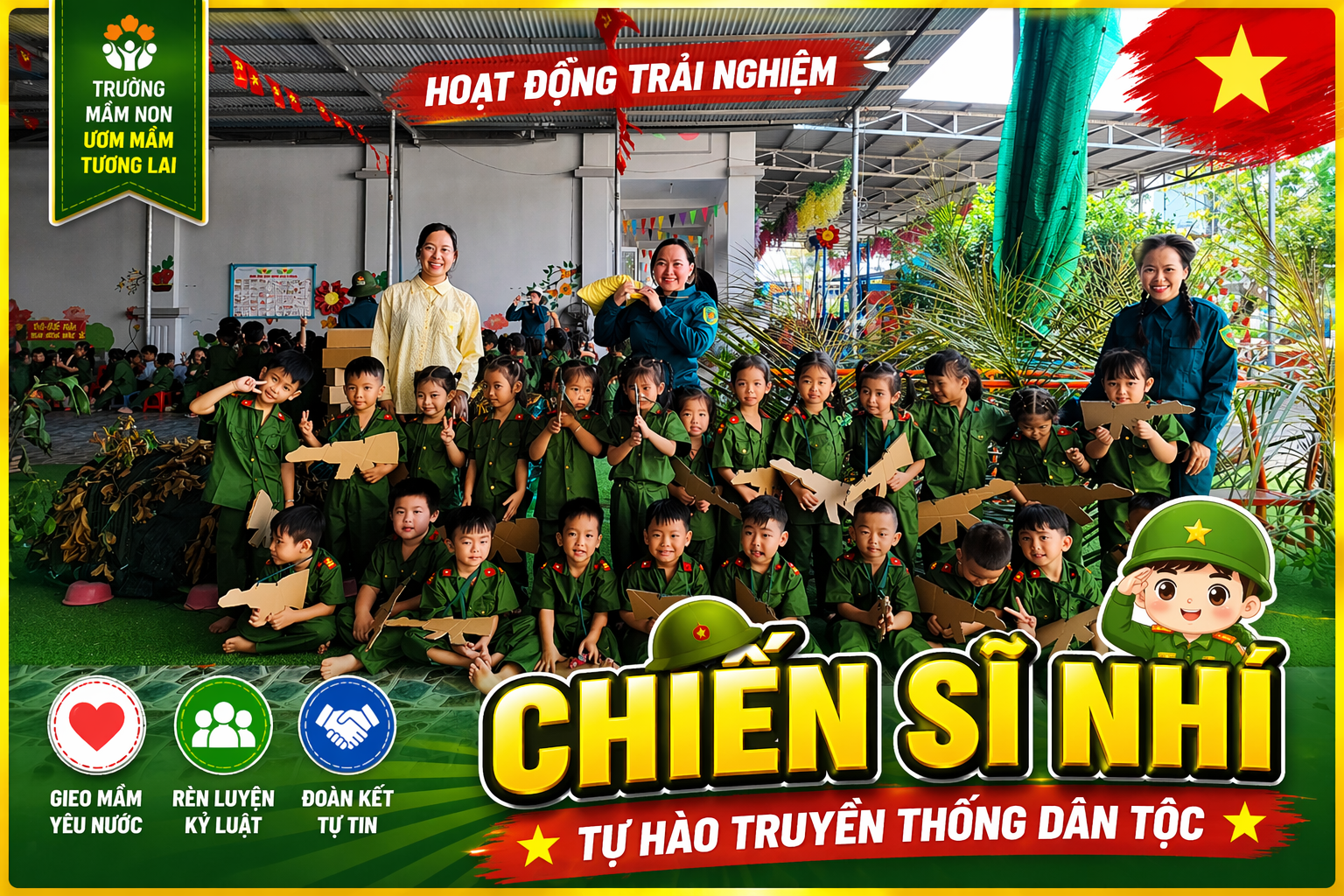 Thông qua hoạt động, trẻ bước đầu được làm quen với hình ảnh người chiến sĩ, hiểu về tinh thần dũng cảm, sự hy sinh và ý chí kiên cường của các thế hệ cha anh. Từ đó, các bé dần hình thành lòng biết ơn, niềm tự hào dân tộc và ý thức giữ gìn những giá trị truyền thống tốt đẹp. Đây chính là nền tảng quan trọng để nuôi dưỡng những công dân có trách nhiệm trong tương lai.
