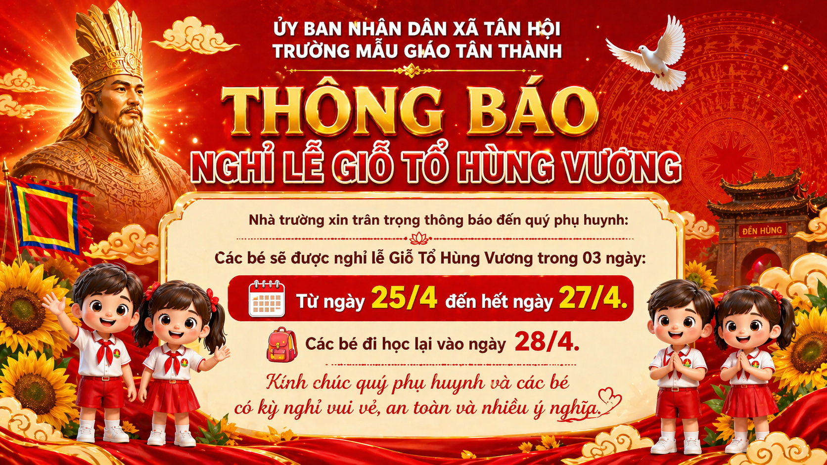 Nhân dịp Giỗ Tổ Hùng Vương (10/3 âm lịch) – ngày lễ thiêng liêng của dân tộc, Trường Mẫu giáo Tân Thành xin trân trọng thông báo đến quý phụ huynh:
