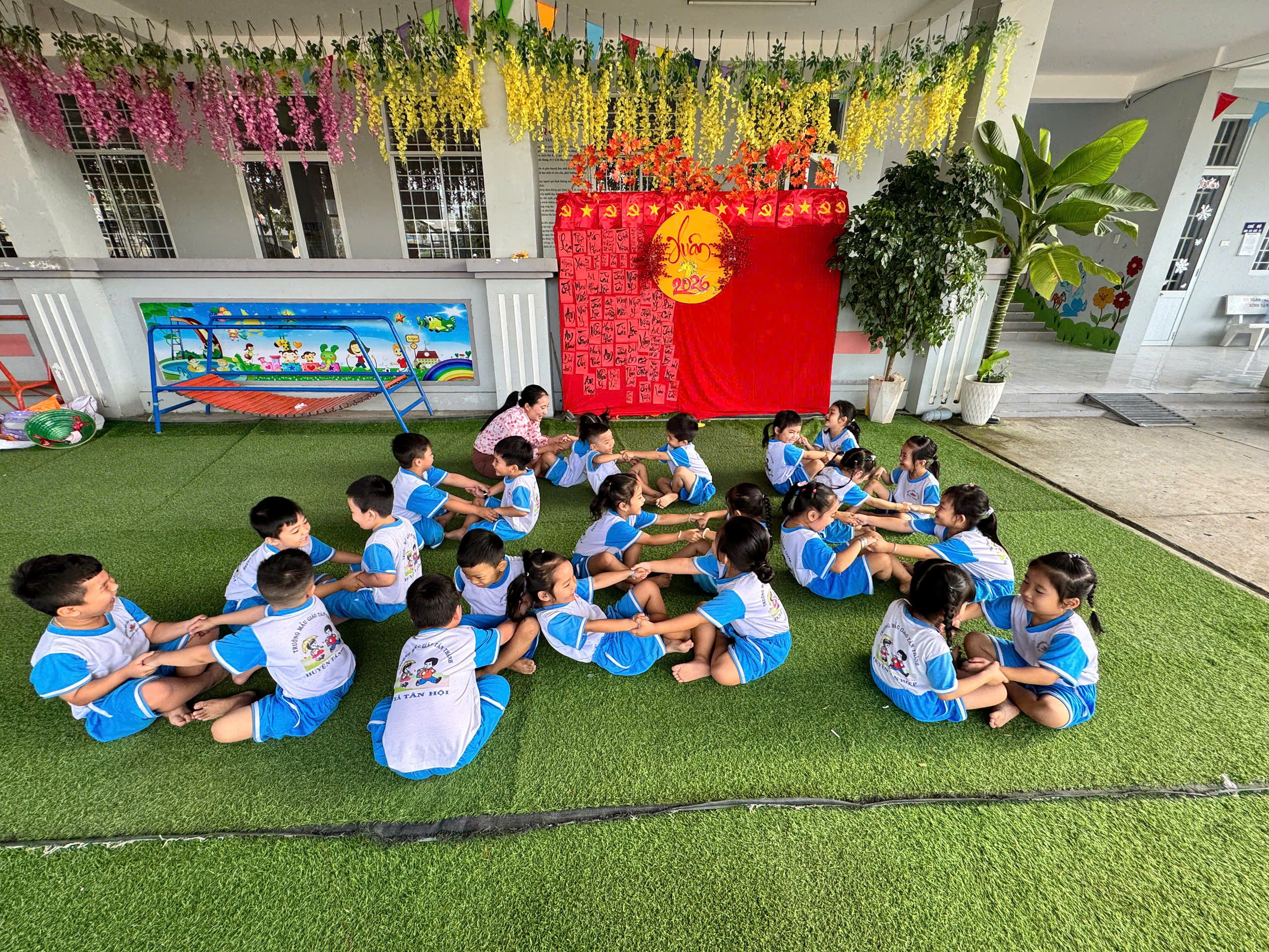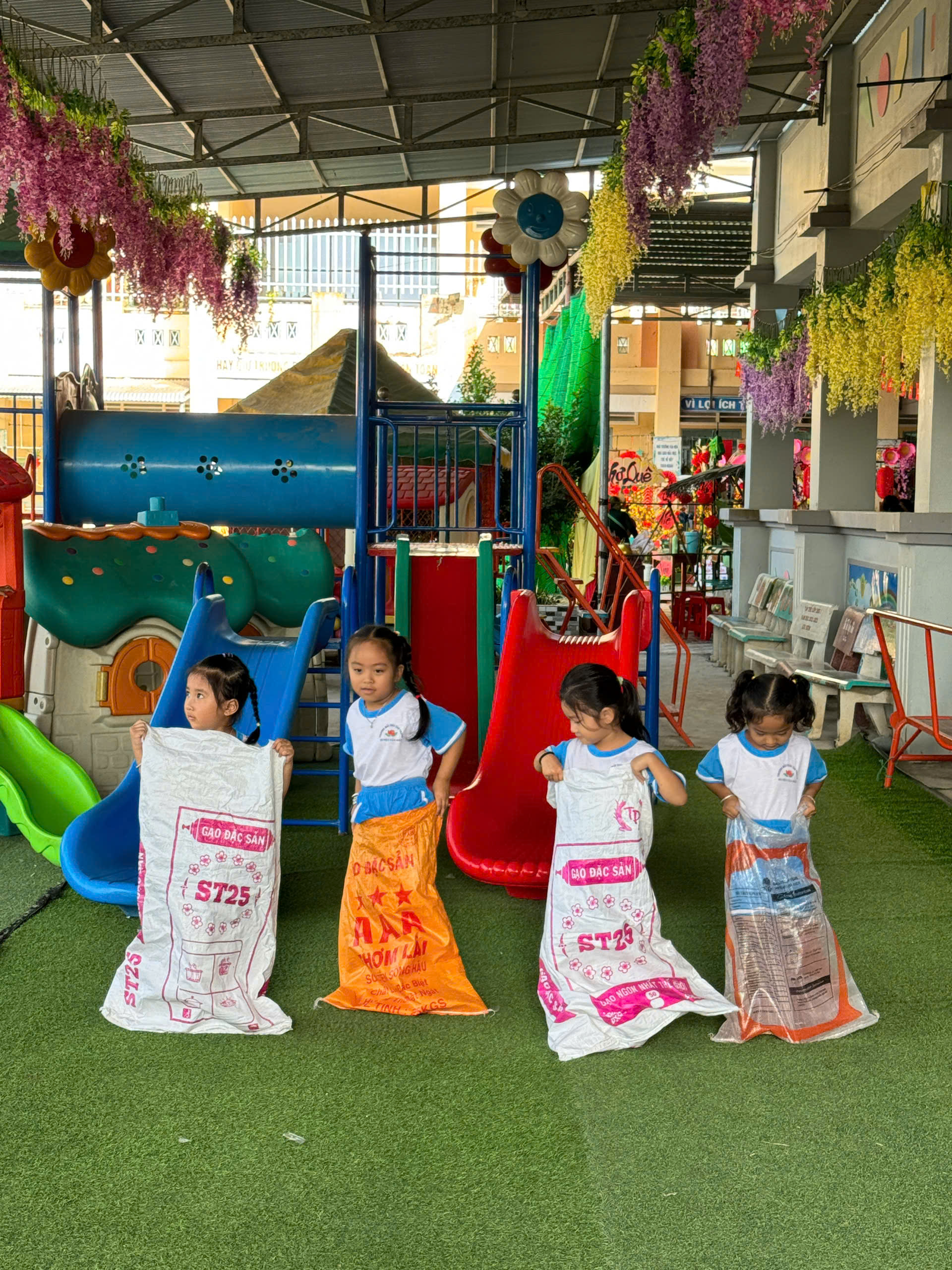 Hoạt động vui chơi với các trò chơi dân gian như “nhảy bao bố”, “kéo cưa lừa xẻ” đã mang đến cho các bé những giây phút thật sôi nổi, hào hứng và tràn đầy tiếng cười 🎉👧👦. Trong không gian sân trường rộng rãi, các bé cùng nhau tham gia từng trò chơi với tinh thần vui vẻ, đoàn kết. Những bước nhảy lò cò trong bao bố tuy còn vụng về nhưng đầy cố gắng 🏃♂️, tiếng cười giòn tan vang lên khi các bé giữ thăng bằng và về đích. Ở trò chơi “kéo cưa lừa xẻ”, các bé ngồi đối diện nhau, nắm tay nhịp nhàng theo lời đồng dao, tạo nên khung cảnh thật đáng yêu và gần gũi 🎶.